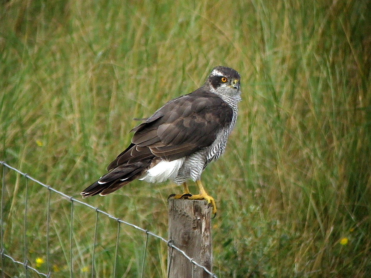 Tegenwoordig ben ik vanuit mijn woonplaats bijna een uur kwijt om met de auto bij De Banken te komen. De route is niet bijster aantrekkelijk. De charme van auto rijden is voor mij vergelijkbaar met scheren of met de afwas doen. Het is niet erg maar ik zou het ook geen passie willen noemen. Zeker bij aardig weer vind ik een uur heen en een uur terug dan ook eigenlijk zonde van de tijd. Een tijd lang kwam ik er dus haast nooit en ook dat wrong een beetje. Een compromis was dus noodzakelijk en ook niet heel ingewikkeld. De fiets gaat op de fietsendrager en de auto brengt mij, binnendoor, in een half uur in Kijkduin. Aan het einde van de Machiel Vrijenhoeklaan is er volop parkeerruimte en nog gratis ook. Vandaar fiets ik dus naar De Banken. Op 16 september 2020 stond er een stevige, frisse noorderwind, die ik op de heenweg dus in de rug had. Door het duin lopen twee prima fietspaden, die zeker niet onderdoen voor het tweestenige paadje dat we vroeger gebruikten. Ongeveer ter hoogte van het natuurgebied Solleveld en de prachtige watertoren van de Westlandse Drinkwater Maatschappij zit er een forse houtduif op het prikkeldraad. Ik vertrouw mijn ogen toch niet helemaal, dus ik stop en kijk door de verrekijker. Havik! De vogel krijgt me in de smiezen en vliegt weg richting zeereep. Maar strijkt daar wel opnieuw neer op een hekje. Een mannetje! Er komt iemand naast mij staan, die uitlegt dat er hier erg veel konijnen in de duinen zitten. De vogel ziet er inderdaad patent en weldoorvoed uit. Bij vogels die niet heel veel moeite hoeven te doen om aan de kost te komen zie je wel vaker dat er een zekere gemakzucht in het gedrag sluipt. Dat hele felle, dat hele waakzame, dat hele verborgene, dat gaat er een beetje van af. Normaal blijft een havik nooit zolang in het zicht. Hij maakt dat hij wegkomt als hij een mens ziet en duikt een bosje in om zich onzichtbaar te maken.