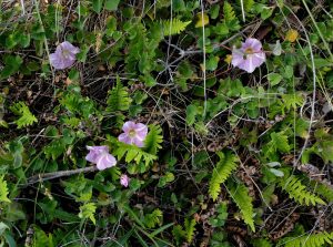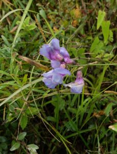 dat moeraslathyrus er nog steeds staat. Nieuw voor mij zijn soorten als duinaveruit, kattendoorn, nachtsilene, veenpluis, gewone vleugeltjesbloem, driedistel en walstrobremraap. Bijzonder is het voorkomen van zeewinde. De soort staat hier een paar honderd meter van de zeereep tussen de eikvarens in een vegetatie van zandzegge en zandblauwtjes. Mogelijk onder invloed van stuivend zand, ze staan er in ieder geval vitaal bij. Een punt van aandacht betreft een flinke groeiplaats van rimpelroos en opslag van dennen. Hier moet niet te lang worden gewacht met ingrijpen.