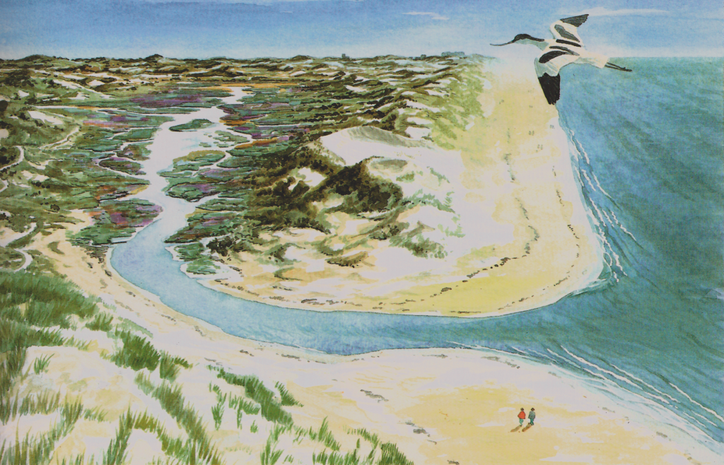(Bijschrift 1995) Toekomstimpressie – in zuidelijke richting – van het kustlandschap ten noorden van Bergen aan Zee. De zeereep is geopend, het Parnassia- en Buizerdvlak zijn weer nat en een kluut zweeft door de lucht boven dit slufterlandschap.