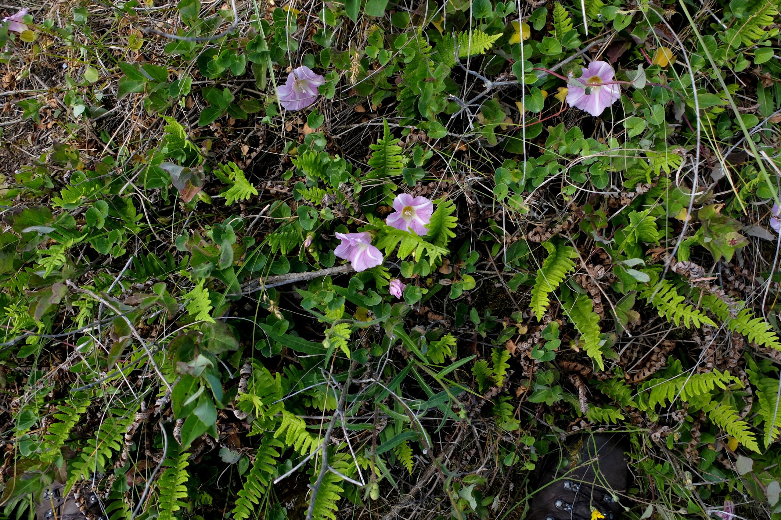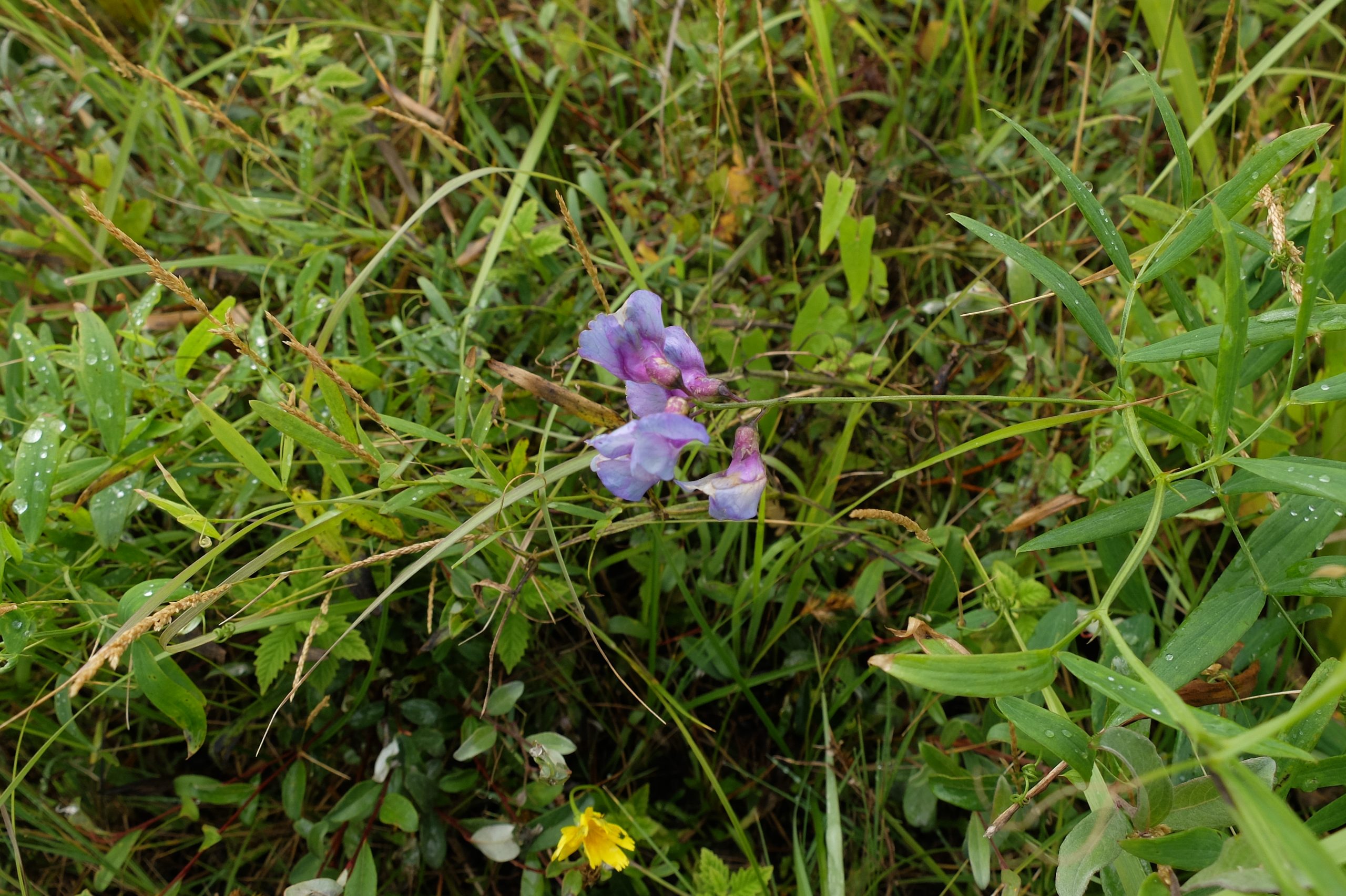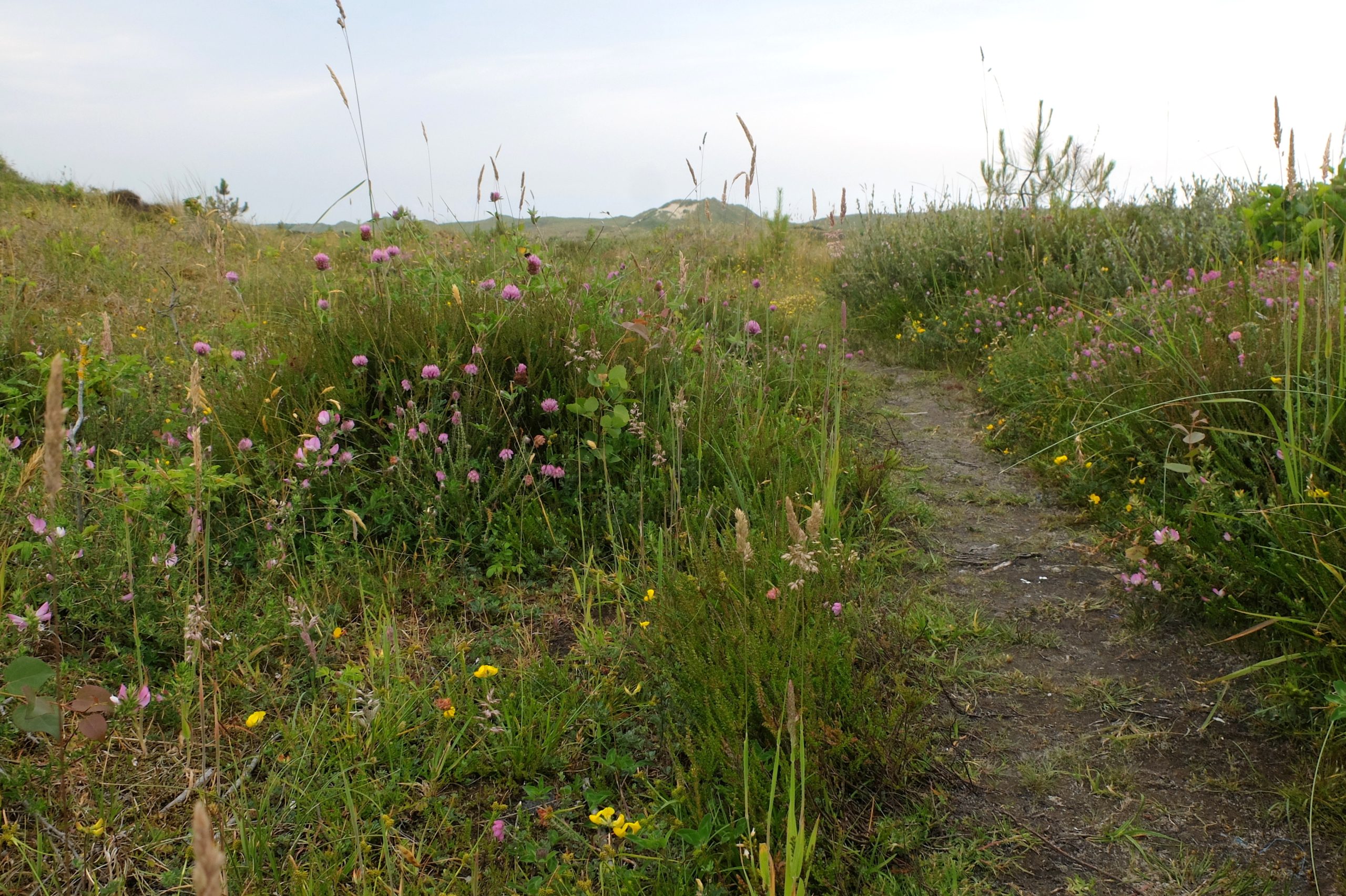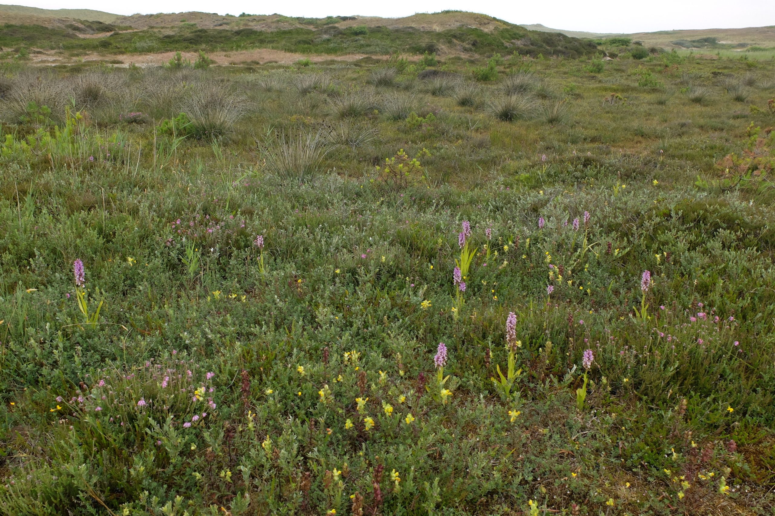 dat moeraslathyrus er nog steeds staat. Nieuw voor mij zijn soorten als duinaveruit, kattendoorn, nachtsilene, veenpluis, gewone vleugeltjesbloem, driedistel en walstrobremraap. Bijzonder is het voorkomen van zeewinde. De soort staat hier een paar honderd meter van de zeereep tussen de eikvarens in een vegetatie van zandzegge en zandblauwtjes. Mogelijk onder invloed van stuivend zand, ze staan er in ieder geval vitaal bij. Een punt van aandacht betreft een flinke groeiplaats van rimpelroos en opslag van dennen. Hier moet niet te lang worden gewacht met ingrijpen.