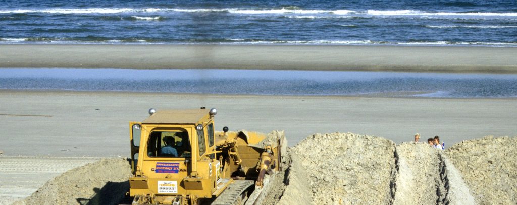 Ameland september 1990: na zandsuppletie vanuit zee wordt met een bulldozer een zanddijk aangelegd. Foto Rijkswaterstaat