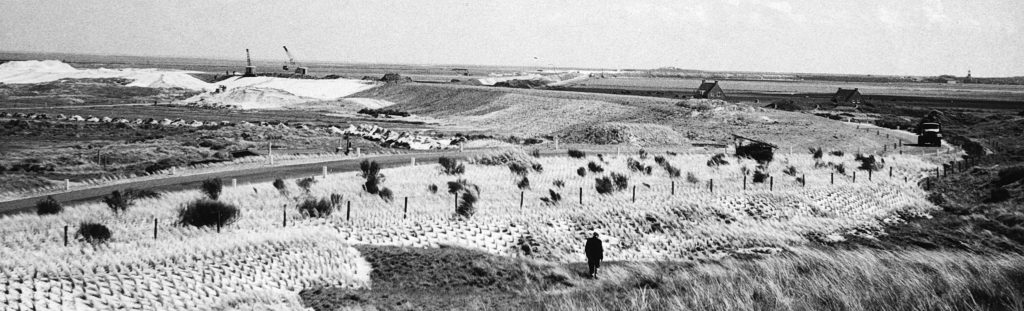 1967: dijken nabij de polder Eierland op Texel worden verzwaard en verhoogd, in dit geval de zanddijk van 1956. Foto Rijkswaterstaat