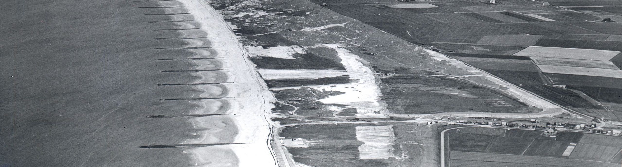 Strand en duinen vanaf Groote Keeten (rechtsonder) naar het noorden in 1954. De oude Zanddijk uit 1629 is duidelijk zichtbaar als een scherpe linie vanaf rechtsonder schuin omhoog. Rechts daarvan de akkers van de polder Koegras. Foto Rijkswaterstaat