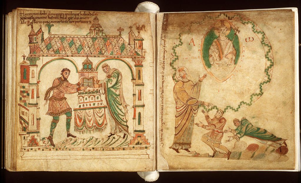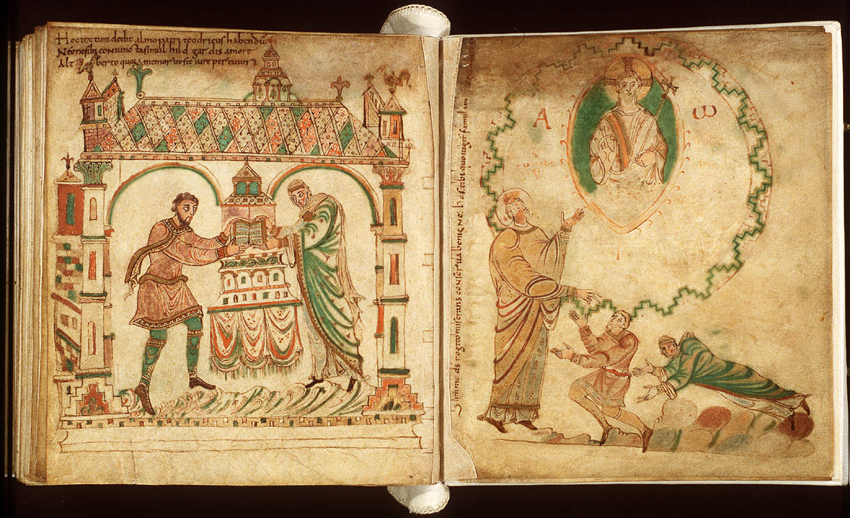 Linker en rechterpagina uit het Evangelieboek (ca 975). Links: Graaf Dirk (II) en zijn vrouw Hildegard leggen het evangeliarium op een altaar. Op de achtergrond zie je de (afgebroken, preromaanse) abdijkerk van Egmond. Linksboven staat een toelichting in het Latijn: ‘Dit boek is geschonken door Dirk en zijn geliefde vrouw Hildegard aan de gezegende vader Adelbert, opdat hij hen rechtvaardig zal gedenken in eeuwigheid.’ Adelbert was de lokale heilige van Egmond en verondersteld eerste kapelbouwer. Op de rechterpagina knielen beide gevers voor de abt van Egmond met op de achtergrond een portret van Adalbert.