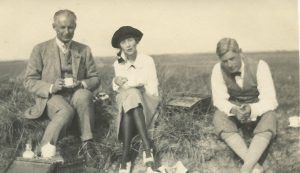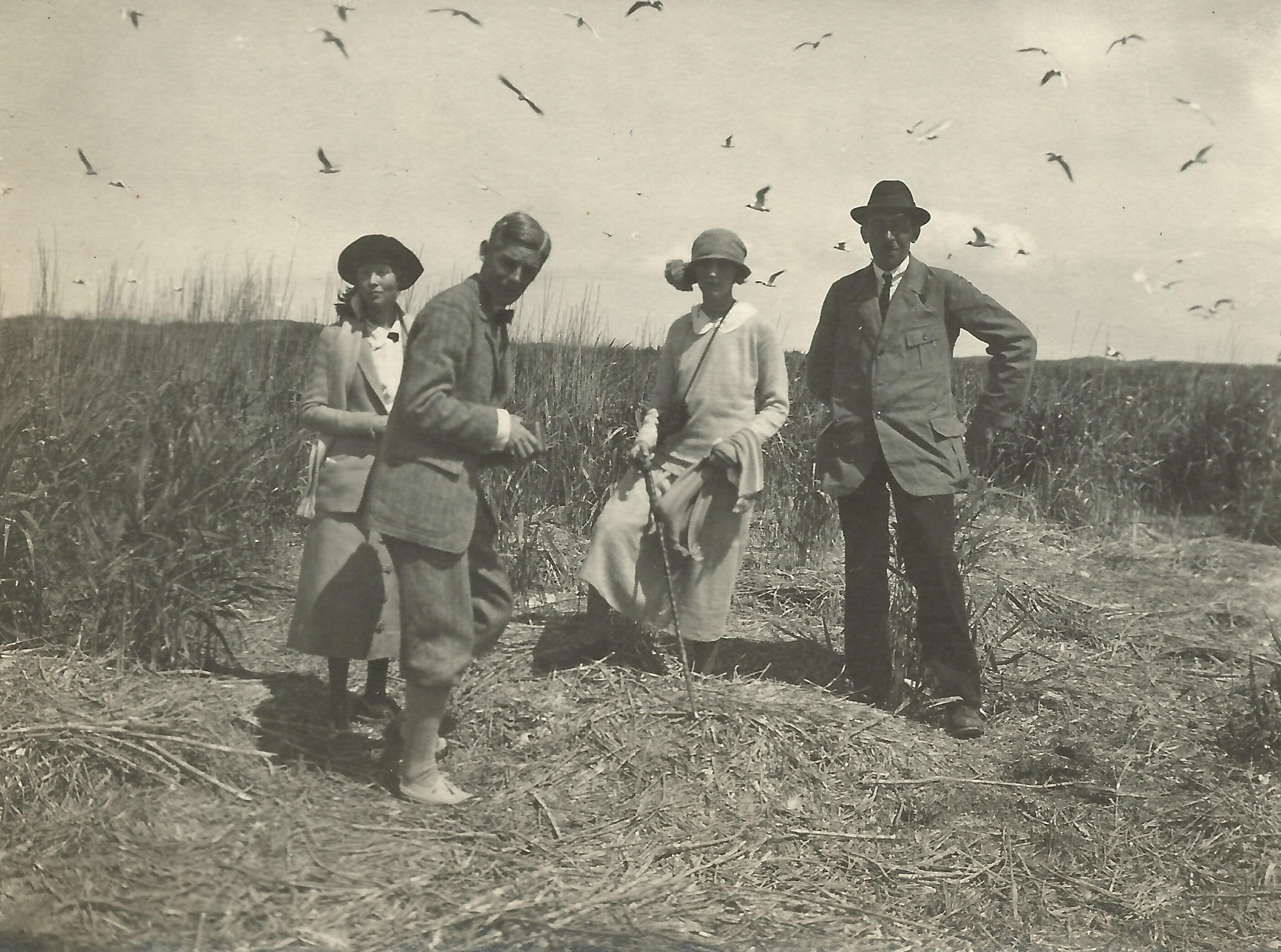 Toegift. Flanerende freules in de kolonie (mevrouw links is A. Leonard en mevrouw rechts is Cecilia Gevers (1888-1978), de echtgenoot van André van de Poll (1884-1966) de toenmalige voorzitter van N.V. Maatschappij “Het Zwanenwater”. Mevr. Leonard was de toenmalige relatie/vriendin/partner van Jonkheer Frits Gevers, de laatste heer van kasteel Marquette in Heemskerk, tevens laatste bewoner van Jachthuis dat nu horecagelegenheid is bij ingang duin Castricum (nabij Kijk Uit). Let op de verrekijker, de wandelstok met rechts onder nog een dode jonge lepelaar). Fotograaf onbekend. Coll. D.van Lunsen