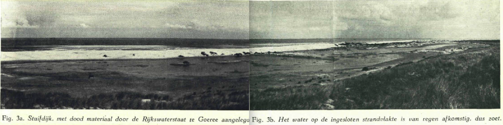 Een van de mooiste voorbeelden van kustaanwas is er wel ten westen van Goedereede, waar de Kwade Hoek op weg is een prachtig natuurmonument te worden. Op het brede strand heeft de Rijkswaterstaat hier de laatste jaren de vorming van een stuifdijk in de hand gewerkt en nu, in 1965, is er al iets wat op een duinenrij gelijkt, die het zoute water voor een deel tegenhoudt en het zoete regenwater vasthoudt, zoals in het begin van september duidelijk te zien was (fig. 3). Wat later, toen er minder regen gevallen was, zag het hier en daar groen van de algen. Als er geen tegenslag komt is daar over enige jaren een lange duinvallei van tientallen hectaren met ongekende perspectieven voor flora en fauna. Want ook bepaalde vogels, als Kieviten en Tureluurs, broeden liever in een korte vegetatie dan in de ruigte.