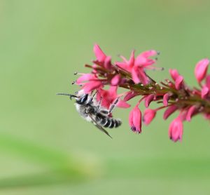 En elk jaar zien we hier andere wilde bijen vliegen, waaronder grijze rimpelrug en kattenstaartdikpootbij. Het hooiland op de Nieuwendijk voor ons huis en ons erf samen herbergen bijna 50 soorten wilde bijen. Voor een ’tuin’ is het heel rijk aan soorten, maar hoe natuurlijk is dat eigenlijk?