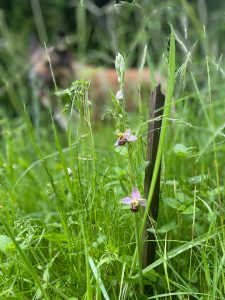 In 2022 troffen we voor het eerst langs ons hooiland een rozet met merkwaardige donkergroene, langwerpige bladeren. Niet van die diep generfde als de algemene smalle weegbree, het was bijenorchis. In 2022 waren er twee exemplaren, in 2023 vijftien, in januari 2024 tel ik er elf, steeds aan de rand van het hooiland, waar het wat schraler is. Ze krijgen geen individuele naam, wel een individueel stokje. Zoals de vogelbeschermer in maart bij elk kievitsnestje een stok zet, zo zwabber ik door het veld, gebogen. Kritische bezoekers vroegen of ik ze niet had geplant. Het is gewoon jaloezie. Al in april laat een knop zich in het hart van het rozet zien, om in mei snel op te stijgen. Een bloemstengel met drie of vier bloemen, hoogte aangepast aan de omringende grassen: liefst net er bovenuit, maar niet te veel.