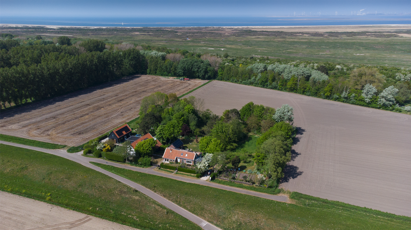 Mei 2022. De dijk, huizen en erven, kale akkers, beboste duinrand en de kust met gorzen van de Kwade Hoek; vanaf 68 meter hoogte noordwaarts gefotografeerd. De meidoorns bloeien, de kastanjes nog net niet. Het voorjaar van 2022 was droog en het land toegankelijk. Een boer ploegt een akker. Foto Henk Terhell.