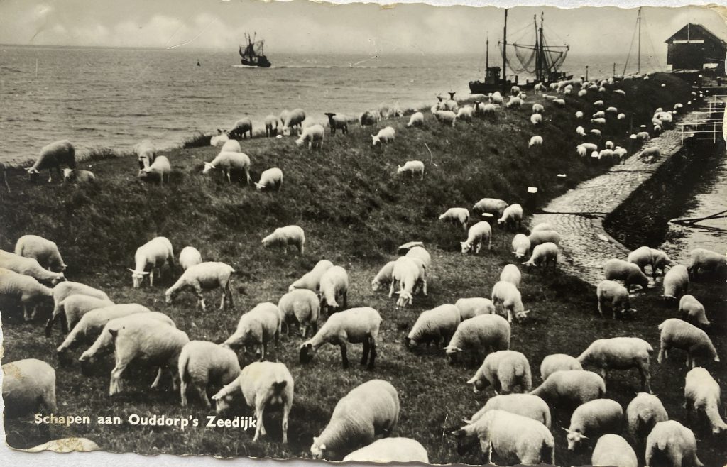 (Over)begrazing van de zeedijk bij Ouddorp, 1960 met visserij op de Grevelingen. Ansichtkaart, Collectie Frans Beekman.