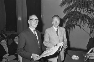 Kees Hana, links op de foto, toen hij in 1966 samen met de destijds populaire presentator Bert Garthoff (rechts) de Heimans- en Thijsseprijs kreeg.