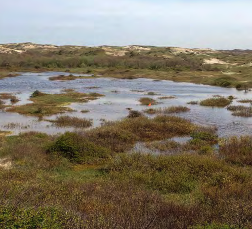 De forse en langdurige neerslag van de afgelopen winter zorgde voor een zeer hoog waterpeil in de duinen. Deze duinvallei in Noord-Holland, groeiplaats van het zeldzame Zandviool- tje, stond daardoor langdurig onder water. Een nieuwe tegenslag voor deze achteruitgaande, kritische soort. Foto: Wim de Groot.