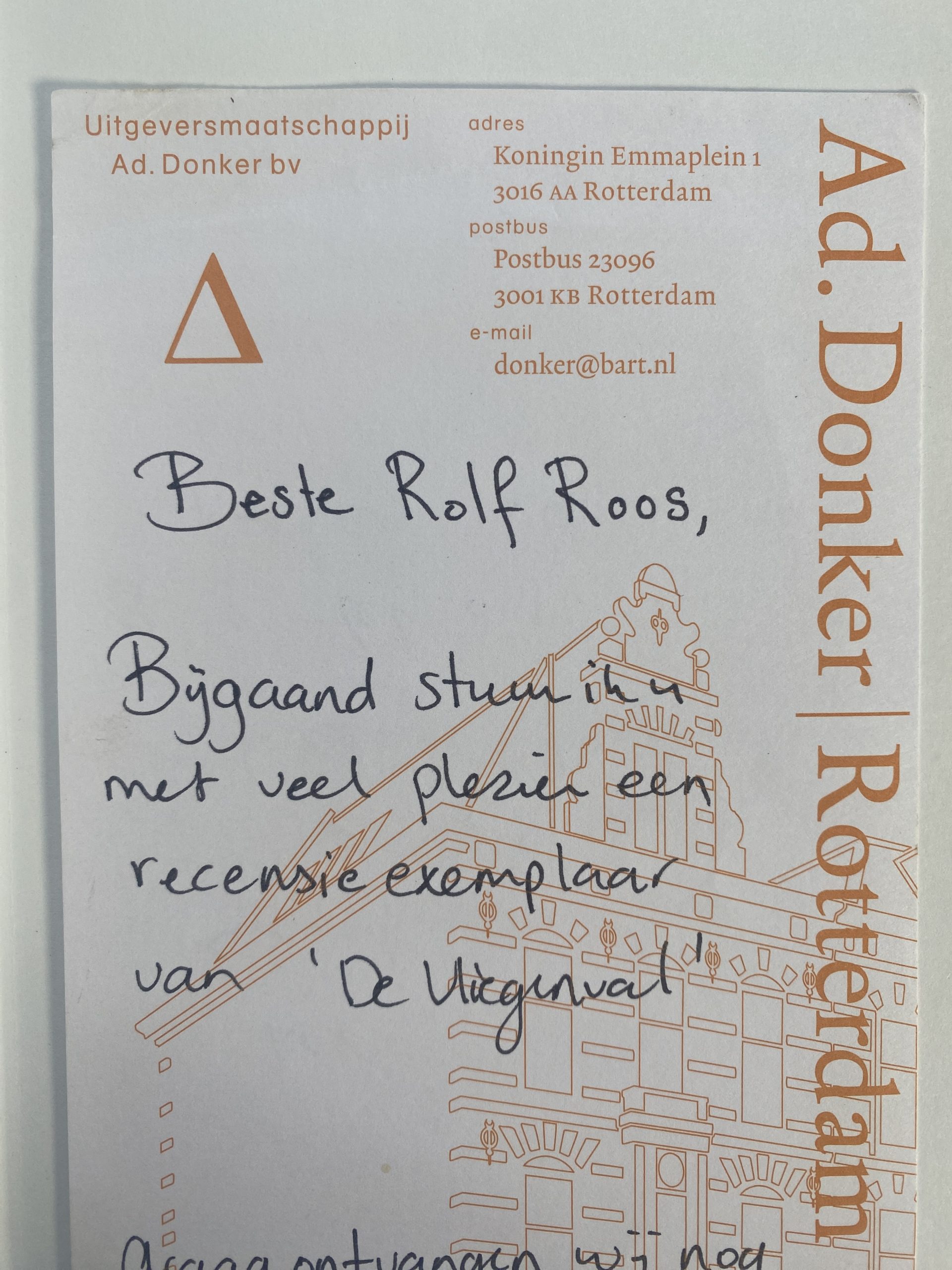 Met ‘Beste Rolf Roos,’ begint de handgeschreven tekst op een ingestoken boekenlegger van Uitgeversmaatschappij Ad. Donker BV. Een datum ontbreekt, maar het zal rond het jaar 2015 zijn geweest. “Bijgaand stuur ik u met veel plezier een recensie-exemplaar van de ‘De Vliegenval’. “