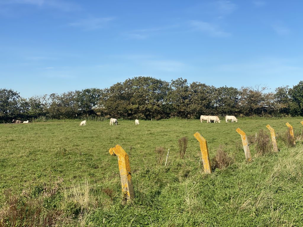 In het voorjaar staan de Charolais koeien vlak bij de boerderij. De betonnen plaatjes (ankers van van zeemijnen uit de oorlog) zitten vol oranje korstmossen.
