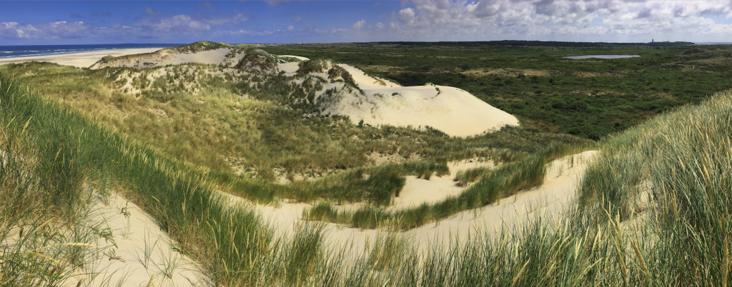 De horizon van Terschelling van Noordsvaarder tot West-Terschelling in 2017. Zandgletsjers rukken op. Het meer ligt in een oude, aangelegde Kroonpolder. Bos staat op de horizon nabij de Brandaris. Er staan nu nog lage struiken in het tussengelegen duinlandschap. Wint de successie of het aanstuivende zand?