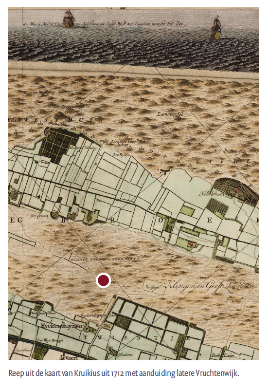 Dankzij de kaart van Kruikius (ook gespeld als Cruquius) uit 1712 dringt het nu pas goed tot me door dat ongeveer heel Den Haag ooit uit hoge en lage duinen met daartussen strandvlaktes bestond. Dat Eyk en Duynen, waar we onze ouders begroeven, uit ‘oude duinen’ bestond en dat er een restant te zien is van een middeleeuwse kapel van de Hollandse graven (helaas geen spoor meer van oude flora hier). Ik kom erachter dat het Binnenhof op een strategische plek aan de rand van het duinlandschap lag. En dat die keurige Vruchtenwijk een 20e-eeuwse uitbreiding was op lage duinen en landerijen, net als de Vogelwijk en in de 19e eeuw het Statenkwartier. Enzovoorts. Het Westduinpark, het huidige duin bij Den Haag en nu beschermd Natura 2000-gebied, bleek een snipper van de voormalige, onafzienbare Westduinen: de naam uit de middeleeuw- en voor al het duin tussen het Binnenhof en de oude Maasmonding achter Ter Heijde en ’s Gravenzande (weer die graaf van Holland). Zo leer je al werkende, mijn duinheelal dijt voortdurend uit.