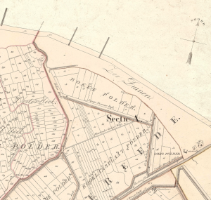 1835 kadasterkaart met o.a. Zeeduinen en dunne markering voorloper Stellingweg en Breestraat; verkaveling in Bokkepolder sinds 1835 nauwelijks veranderd; Polder Oude Oostdijk is genivelleerd