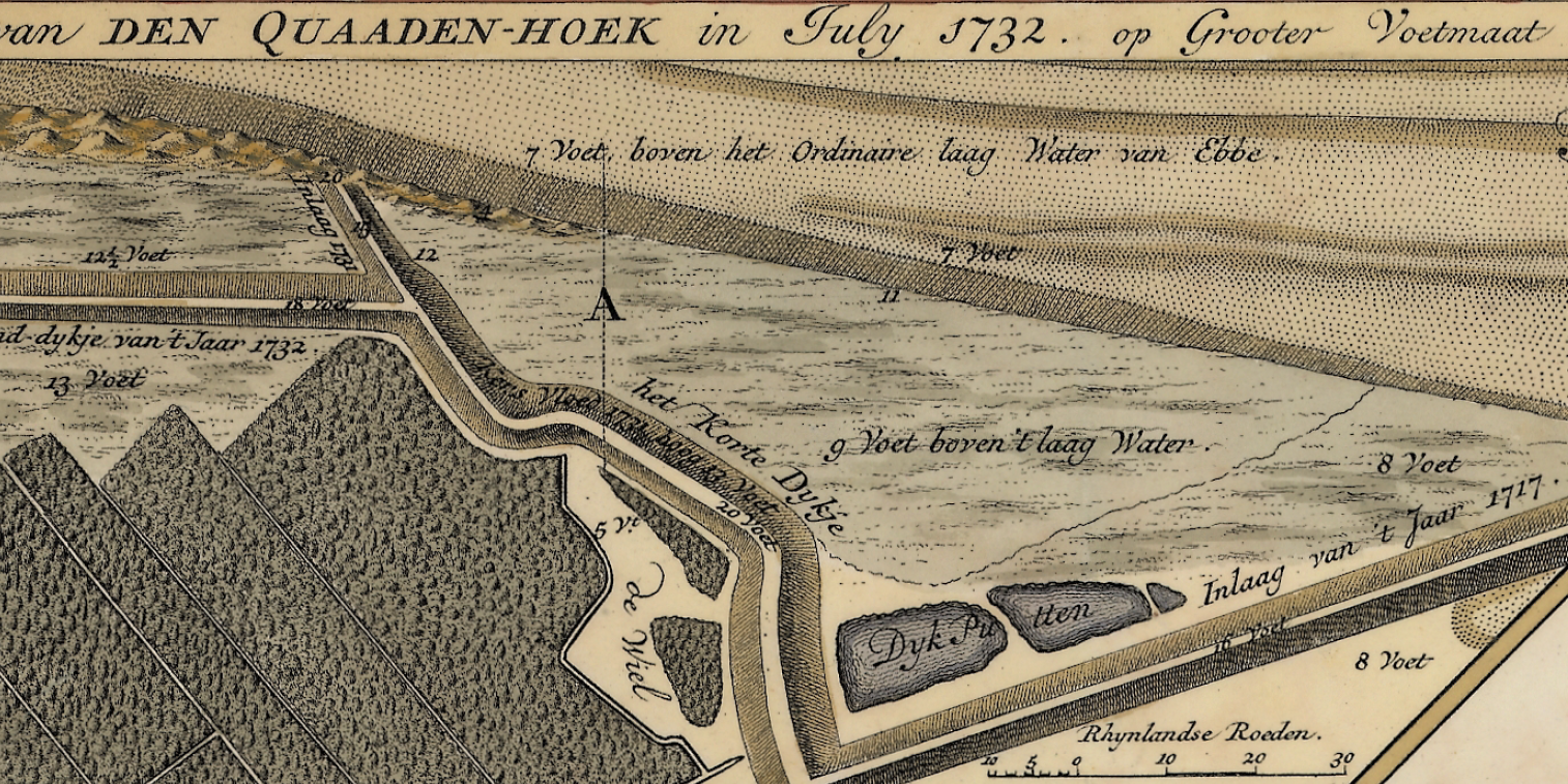 t’ Plaatje e.o. 1732 Kaart Cruquius 1733 detail. Het Korte Dijkje in deze vorm is waarschijnlijk van 1717 en werd gelegd rond de Wiel (zie kaart) Was wiel resultante van doorbraak 1715 of eerder? In 1731 hield het Korte dijkje (20 voet hoog)het water kwam tot 12 voet op 26 december (zie de kleine lettertjes); doorbraak was iets oostelijker. Verder we denken dat er allemaal bos staat aangegeven ten oosten van het Korte Dijkje, maar dat kan niet als er een doorbraak was in 1715. De bossige structuren ten oosten van het dijkje zijn onwaarschijnlijk als er doorbraak was in 1715; of het is iets anders dan bos: kreupelhout, laag struweel, ruigte bv.?
