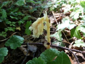Stofzaad. Hier op de foto net uit de grond opduikend aan de voet van de Papenberg (foto Thea Spruyt). In kalkrijke duinbossen bij Kennemerland algemener dan werd gedacht maar wel bedreigd!