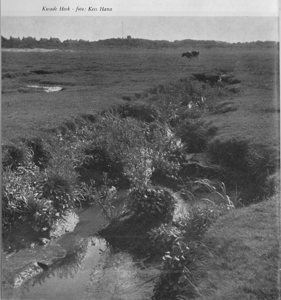 In een boekje over Goeree van Kees Hana uit 1963 (op duinenenmensen.nl als pdf te vinden) staat een helaas wat vage foto van de Kwade Hoek: een koe op het gors (het schor, de kwelder).  In die tijd noemde Kommer Hoek (overleden 2025) uit Ouddorp het gebied nog ‘het weiland’ en dat is wel te begrijpen, zo kort als het oogt. Maar het bijzondere van deze foto is het rijtje huizen dat links boven nog net zichtbaar is. De vissershuisjes van Havenhoofd (die in 1953 bij watersnoodramp wel bedreigd werden maar net droog bleven, zie foto onderaan) hadden nog vrij zicht op zee! Het Haringvliet ging in de loop van de jaren ’60 dicht maar de zeereepverhoging naar plus 12m boven NAP vond ruim na 1963 plaats, namelijk pas in 1970, door de firma van de gebroeders Oosterling uit Middelharnis die deze klus voor Rijkswaterstaat klaarden. Toen was het ruime zicht van de vissers voorgoed verleden tijd en sindsdien ligt er een als duin vermomde dijk. Alleen de kunstmatige ophoging met ‘Huize De Bult’ ter hoogte het begin van de Stellingweg bood nog een tijd uitzicht op zee. Totdat het oprukkend bos en vlierstruweel ook hier de zeereep bedekte.