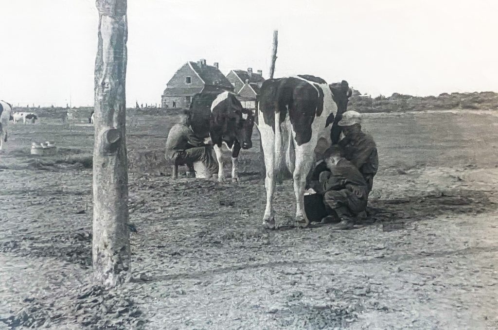 Meer koeien en zicht op huizen Havenhoofd gevonden dankzij de vrouw van Kommer de Brommer jr, Maaike, die ons met haar kinderen inzage gaf in familiealbums. Daarbij zat deze foto met de huisjes op het Haveneind, nog met het vrije zicht op het schors en Kommer de Brommer sr links achteraan met  hand melken ca 1955. Man met pet en kind onbekend.