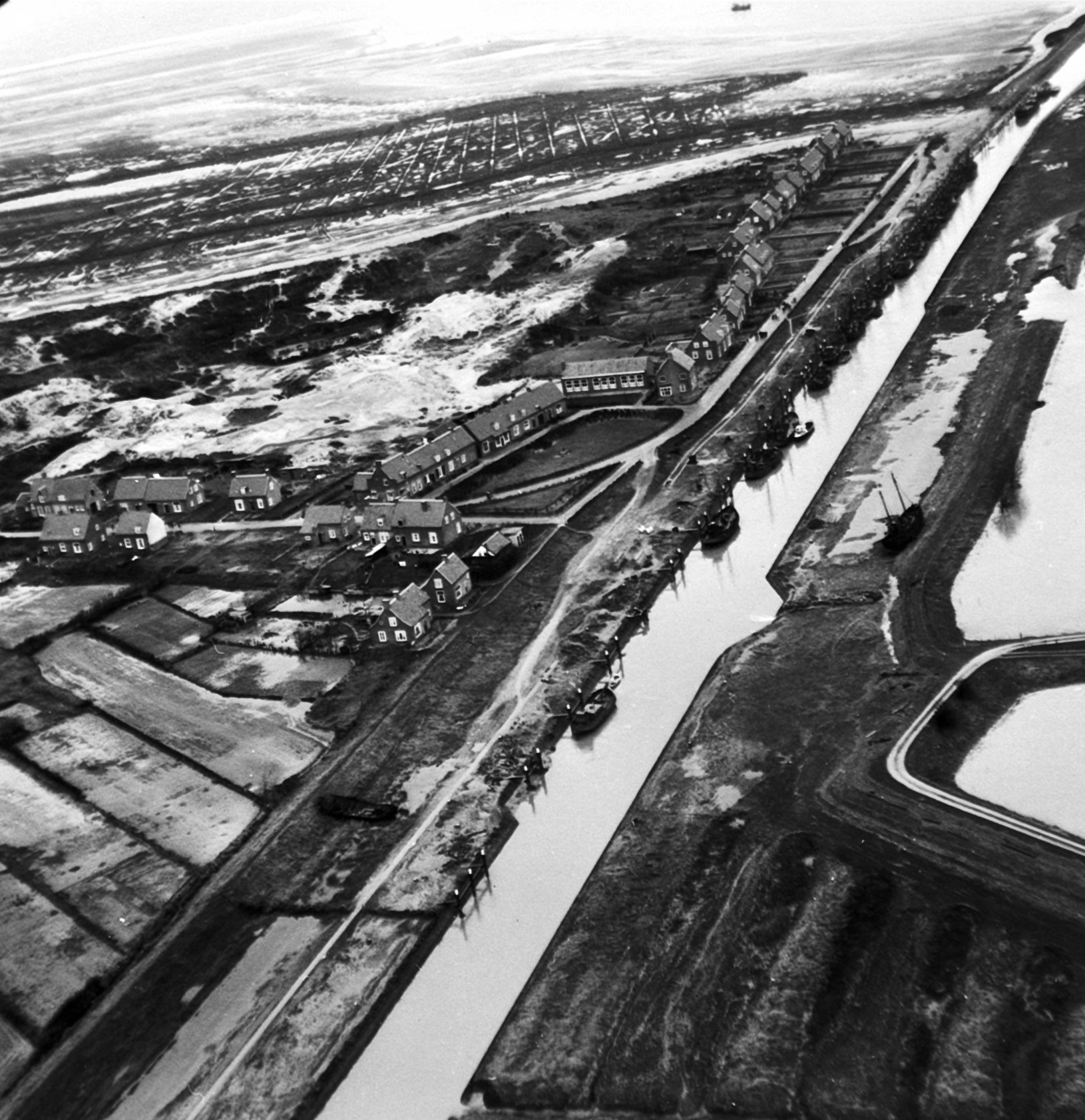 1953, na de stormvloed van februari, huizen Haveneind zijn net niet onder gelopen; let op schip dat op de wal is geworpen. In het gors zijn de ontwateringssloten van die tijd goed zichtbaar.