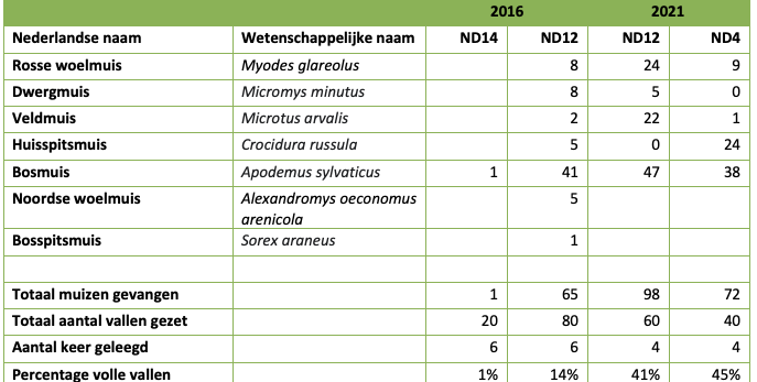 In 2021 werden 170 muizen gevangen verdeeld over 5 soorten. Ook in 2021 werd het onderzoek verdeeld over twee percelen op de Nieuwendijk (ND). In 2021 is er een totaal ander beeld dan in 2016: de noordse woelmuis is niet gevonden en de rosse woelmuis heeft zich sterk uitgebreid. Deze laatste is in 2010 voor het eerst gezien op de Punt bij Ouddorp. Vier jaar later was deze massaal verspreid over Goeree-Overflakkee. Het is mogelijk dat de noordse woelmuis het aflegt tegen andere woelmuizen zoals de rosse woelmuis en de veldmuis. Kan de noordse woelmuis uitwijken naar een nattere biotoop dan kan die zich daar handhaven, nattigheid is minder geschikt voor de andere soorten woelmuizen. Veldmuizen kunnen zich goed handhaven bij droogte. Vooral de laatste jaren van zomerse droogtes kunnen in het voordeel zijn geweest van de veldmuis. Werd de veldmuis in 2016 nauwelijks gevangen, in 2021 is deze met 23 muizen goed vertegenwoordigd.