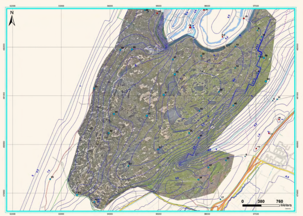 Dat het zo kletsnat was, was goed te zien. Op veel plekken stond zichtbaar (veel) meer water dan anders. Zelfs duindoornvalleitjes vlak achter de zeereep die normaalgesproken jaarrond droog zijn, stonden vol. In het zuidelijk deel van het gebied was de situatie het duidelijkst waarneembaar. Zo stonden op meerdere plekken werk- en wandel- paden onder water en kon het zweef- vliegveld niet gebruikt worden omdat de start- en landingsbaan blank stond. De grondwaterstand was op veel locaties vele decimeters hoger dan het jaargemiddelde over een halve eeuw voor 2024 (Figuur 2).