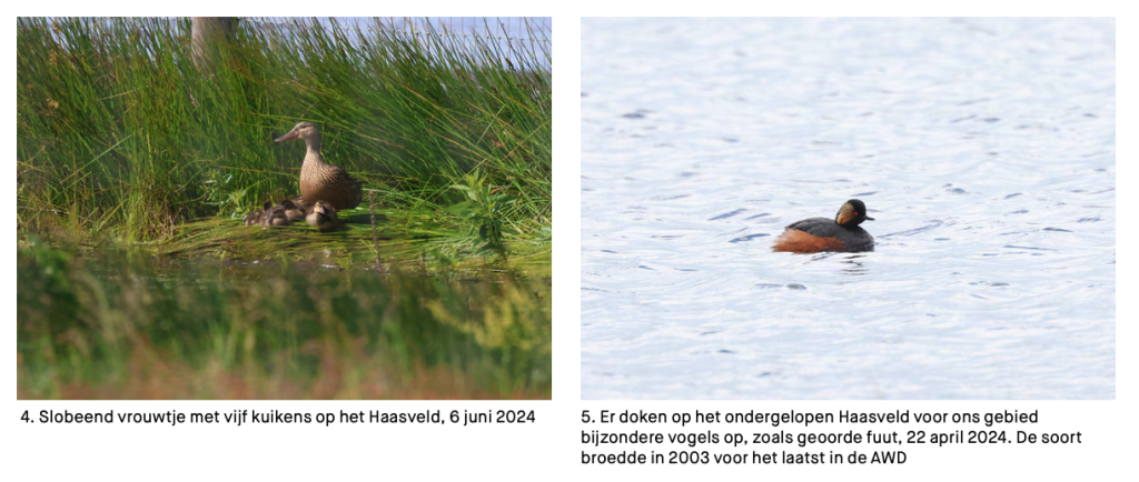Door de hoge waterstanden ontstond een uniek (tijdelijk) plas-drasgebied. In de winter zwom er al een groepje wilde zwanen met één kleine zwaan rond, maar in het voorjaar werd de grote aantrekkingskracht op watervogels pas echt zichtbaar. Tijdens de trek streken vooral veel steltlopers neer die niet vaak in het duin rusten, zoals diverse Temmincks strandlopers, kanoeten, kemphanen, bosruiters en zelfs een steltkluut, breedbekstrandloper (een nieuwe soort voor de AWD) en een griel. Een onverwachte zeldzaamheid was een Amerikaanse wintertaling (eveneens nieuw voor de AWD). Er foerageer- den verder grote groepen (gier)zwaluwen. Maar het meest bijzonder waren de broedvogels. De kieviten (minimaal 4 paar) en kleine plevieren (minimaal 3 paar) waren gebleven en brachten vliegvlugge jongen voort, maar werden dit jaar aangevuld met veel watervogels. Er waren tientallenkrakeenden, een dozijn meerkoeten en twee paar dodaars. Een mannetje pijlstaart leek ongepaard, maar diverse slob- en bergeenden hadden meer geluk in de liefde. Van die soorten werden kuikens gezien (afb. 4).