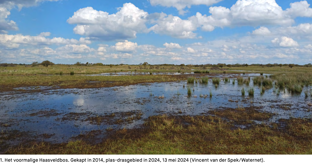 Het was ook goed zichtbaar rond het Haasveld, een populair wandelgebied (Figuur 1 & 3). In 2014 kapte Waternet hier een geïsoleerd naaldbos. Niet iedereen was daar blij mee, want er broedden destijds een grote lijster en een bosuil, maar Waternet koos voor kap omdat het bos was aangeplant op een locatie waar ooit een grote vochtige duinvallei had gelegen. Die hoopte Waternet in ere te herstellen. Sindsdien broeden er jaarlijks (vaak met succes) kieviten en kleine plevieren.