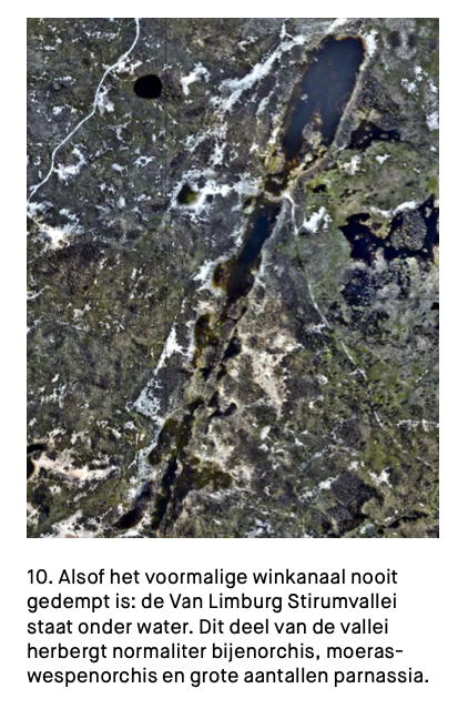 Helaas blijft het afsterven niet beperkt tot de naaldbomen op het Achterhaasveld. De Van Limburg Stirum-vallei (VLS-vallei) ontstond nadat midden jaren ’90 het zuidelijke deel van het VLS-kanaal werd gedempt. De vallei ontwikkelde zich tot één van de mooiste binnen de AWD, met zeldzame plantensoorten als bitterling (Blackstonia perfoliata), rond wintergroen (Pyrola rotundifolia), addertong (Ophioglossum vulgatum), parnassia (Parnassia palustris), slanke gentiaan (Gentianella amarella), bijenorchis (Ophrys apifera), moeraswespenorchis (Epipactis palustris), rietorchis (Dactylorhiza praetermissa) en sinds kort zelfs de zeer zeldzame duinwespenorchis (Epipactis helleborine subsp. neerlandica). Deze soorten kwamen vrijwel uitsluitend voor in en rond de vele vochtige duinvalleitjes die de VLS-vallei rijk was. Die valleitjes komen in de wintermaanden vaak onder water te staan, en vallen dan normaal gesproken in het voorjaar droog, waarna bijzondere planten in de (na)zomer tot bloei komen. Maar medio juni stonden die duinvalleitjes nog steeds onder water, inmiddels ruim acht maanden zonder onderbreking. En in de winter en het voorjaar stond het water veel hoger dan ooit. Deze combinatie kan fataal zijn voor deze zeldzame soorten. Waar in juni vorig jaar nog vele honderden rietorchissen en moeraswespenorchissen bloeiden, zwemmen nu padden- en kikkervisjes. Maar medio juni bleek de op een iets hoger deel gelegen duinwespenorchis-populatie zich gelukkig redelijk te handhaven, en werden er verspreid ook circa 80 moeraswespenorchissen gezien. Die stonden allemaal geheel of bijna geheel onder water, aan de randen van de groeiplaatsen die veel minder lang on- der water dan de centrale delen. Kennelijk weet de moeraswespenorchis dat nog te overleven. Van de vele bijenorchissen en rietorchissen uit 2023 was echter geen spoor meer te bekennen. Een vergelijkbaar beeld was te zien op de Bokkenwei, de Klazewei en de Hazenlegers (met resp. grote keverorchis (Neottia ovata), moeraswespenorchis (Epipactis palustris) en slanke gentiaan (Gentianella amarella). Hoe dit zich op de langere termijn gaat ontwikkelen is onduidelijk. Het is afwachten wat het klimaat ons de komende jaren gaat voorschotelen, en hoe de natuur erop gaat reageren. Als dit het “nieuwe normaal” wordt, zullen er ongetwijfeld nieuwe groeiplaatsen ontstaan. Mogelijk zelfs meer dan er waren, omdat er dan meer vochtige duinvalleitjes zijn. Als de huidige extreme nattigheid eenmalig is en het waterniveau op den duur zal terugkeren naar het oude peil, kan hopelijk (gedeeltelijk?) herstel optreden. In beide gevallen zal dat herstel vermoedelijk enkele jaren duren. Tot die tijd zal de AWD helaas veel minder bijzondere planten herbergen dan tot vorig jaar nog het geval was.