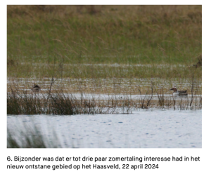 Door de hoge waterstanden ontstond een uniek (tijdelijk) plas-drasgebied. In de winter zwom er al een groepje wilde zwanen met één kleine zwaan rond, maar in het voorjaar werd de grote aantrekkingskracht op watervogels pas echt zichtbaar. Tijdens de trek streken vooral veel steltlopers neer die niet vaak in het duin rusten, zoals diverse Temmincks strandlopers, kanoeten, kemphanen, bosruiters en zelfs een steltkluut, breedbekstrandloper (een nieuwe soort voor de AWD) en een griel. Een onverwachte zeldzaamheid was een Amerikaanse wintertaling (eveneens nieuw voor de AWD). Er foerageer- den verder grote groepen (gier)zwaluwen. Maar het meest bijzonder waren de broedvogels. De kieviten (minimaal 4 paar) en kleine plevieren (minimaal 3 paar) waren gebleven en brachten vliegvlugge jongen voort, maar werden dit jaar aangevuld met veel watervogels. Er waren tientallenkrakeenden, een dozijn meerkoeten en twee paar dodaars. Een mannetje pijlstaart leek ongepaard, maar diverse slob- en bergeenden hadden meer geluk in de liefde. Van die soorten werden kuikens gezien (afb. 4).