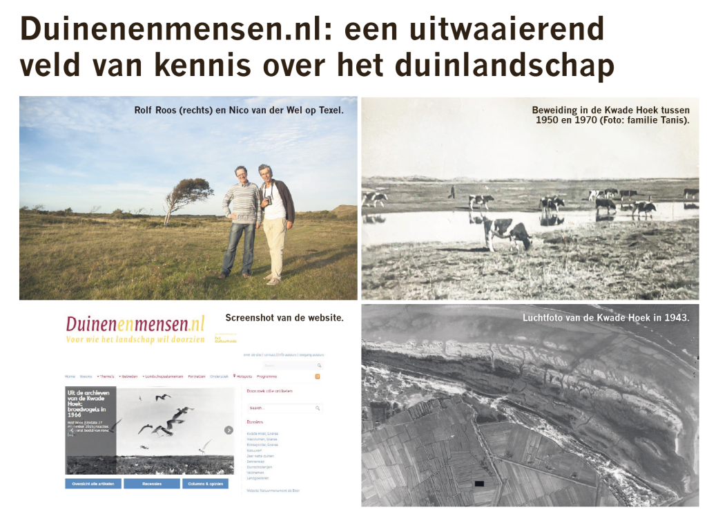“ Al jaren is de website Duinenenmensen.nl het forum voor iedereen die zich verdiept in het Nederlandse duinlandschap. ‘Voor wie het landschap wil doorzien’, luidt de veelzeggende leuze. Dat ‘doorzien’ is breed. De website focust niet alleen op natuur en landschap, maar ook op historie, cultuur, exploitatie en archeologie.”