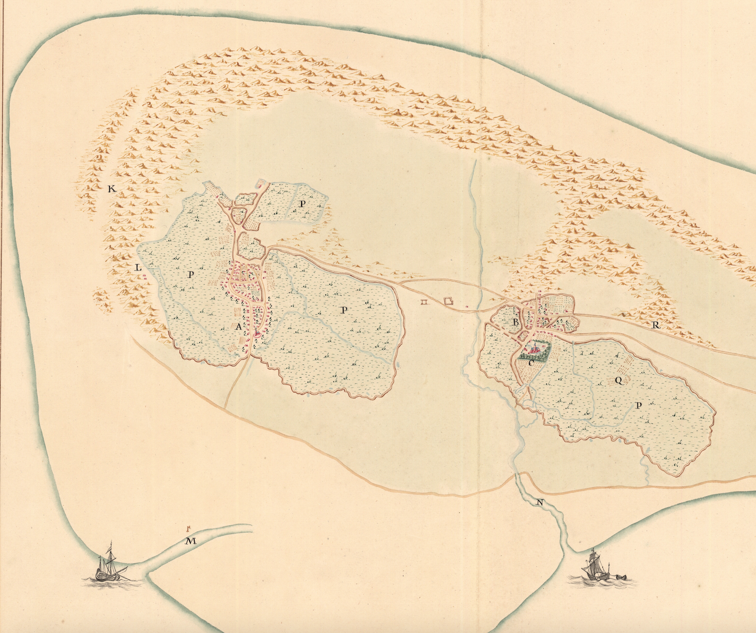 Kaart deel Ameland, 1731. De galg lag in de kwelders tussen Hollum en Ballum