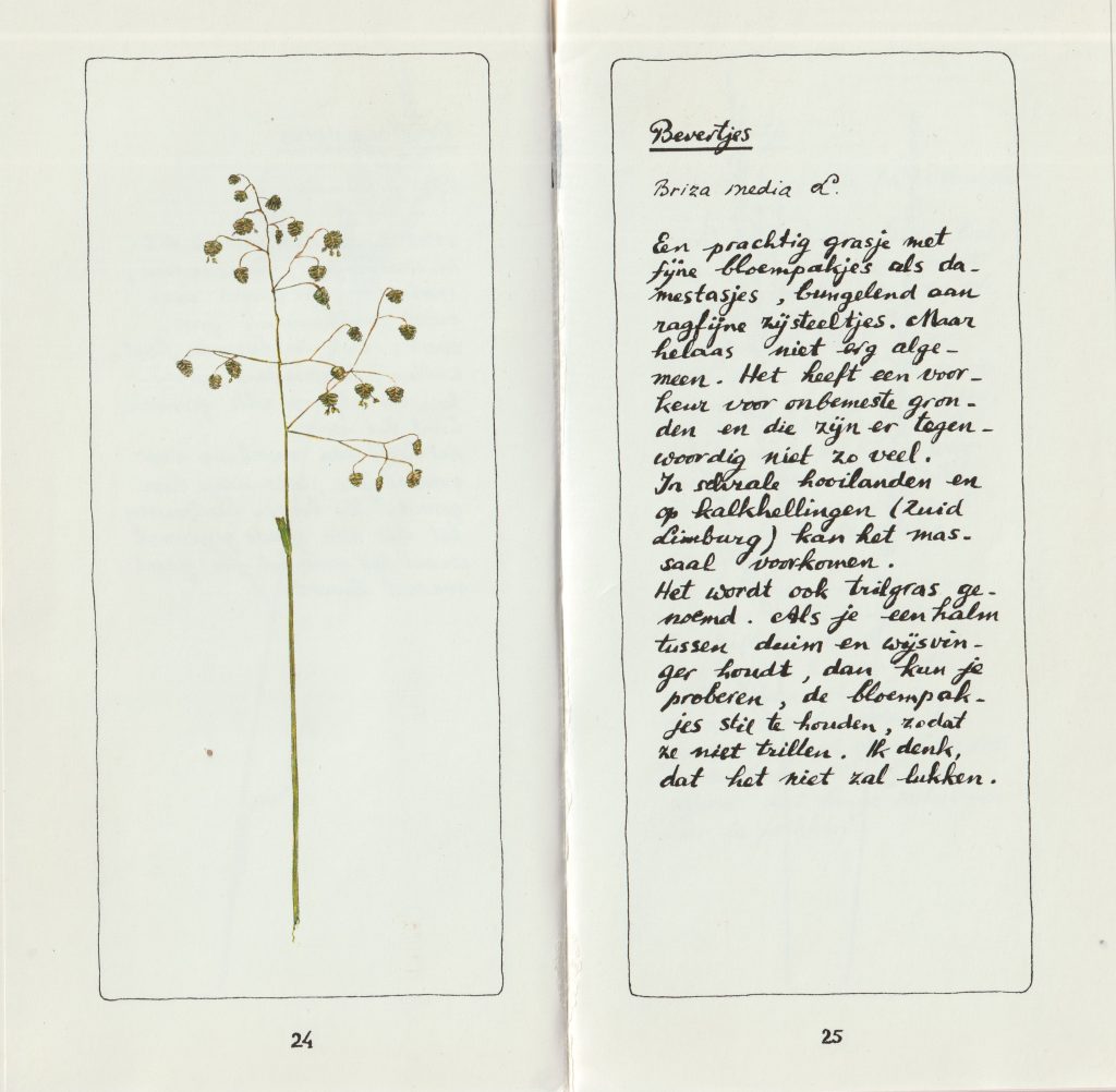 Een prachtig grasje met fijne bloempakjes als damestasjes, bungelend aan ragfijne zijsteeltjes. (…) Het wordt ook trilgras genoemd. Als je een halm tussen duim en wijsvinger houdt, dan kun je proberen, de bloempakjes stil te houden, zodat ze niet trillen. Ik denk dat het niet zal lukken.