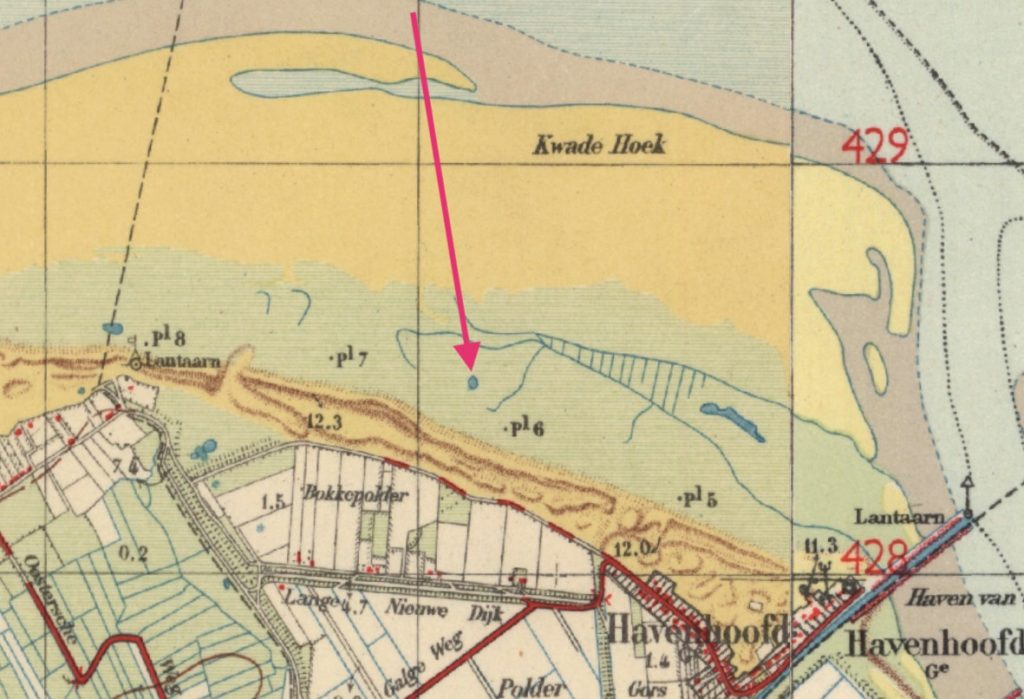 Op de topografische kaart Kwade Hoek ca 1950 staat bij de pijl een rond watertje aangegeven op de plek van de huidige ronde structuur.