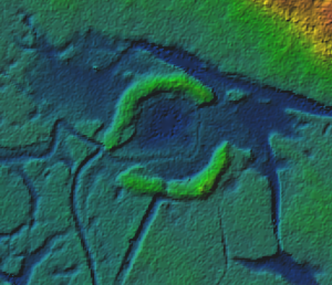 We zoomen nu in op een klein deel van de Kwade Hoek. Zie de kaart links. Zelf ben ik al een tijdje geïntrigeerd door een alleen op de hoogtekaart (hieronder) zichtbare, ronde vorm van ca 5m in doorsnede met een lage wal er om heen die op twee zijdes is geopend (A). Voor wie wil fantaseren kan er een oud heiligdom in zien met in- en uitgang. Of een kleine ronde burcht, een motte wellicht. Of een ringwal. Er zijn veel hypotheses mogelijk, maar duidelijk is slechts één ding: de van de natuur afwijkende vorm is manmade. Maar wat is het?