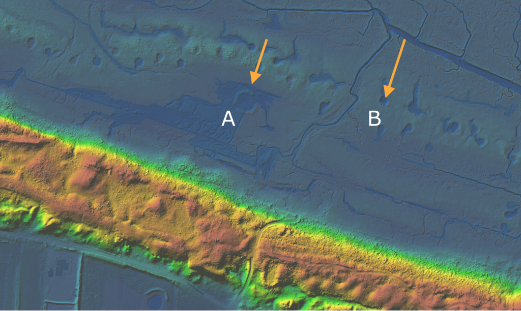 Detail zeereep met hoogteverschillen in het Koeiengors van de Kwade Hoek en bij A de hier besproken ‘ringburcht’ en bij B een bomkrater (eentje uit een rommelige rij).