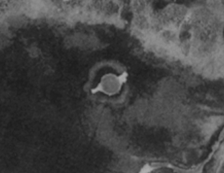 Op de topografische kaart Kwade Hoek ca 1950 staat bij de pijl een rond watertje aangegeven op de plek van de huidige ronde structuur.