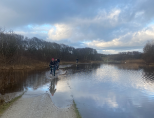 Het Westerduinpad stond onder water, ook onze honden kregen natte poten.