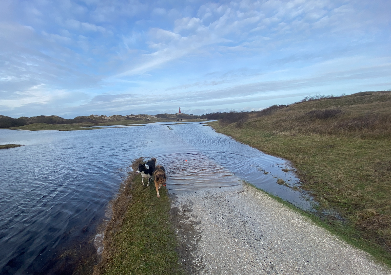Het Westerduinpad stond onder water, ook onze honden kregen natte poten.