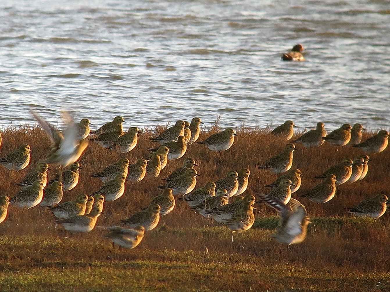 Storm hoort er bij op Texel en als het niet stormt dan waait het toch vaak wel stevig. Prettig om het in je rug te hebben, maar je moet ook weer terug. Zo zwoegden we een keer deels langs, deels over de Waddendijk, gebogen over het stuur met alleen maar de warmte van het vakantiehuisje en de borrel die daar klaar stond in gedachten. Laat in de middag. De blik gericht op het plaveisel. Pas op het laatste moment kijk ik naar rechts: het hele weiland staat stampvol met goudplevieren! Vogeltje aan vogeltje. Alle snavels in de richting van de zuidwester die wij aan het trotseren waren. Ze vlogen niet eens op. Wij dorsten niet stil te staan. Hoe noem je zo iets? A close encounter of the third kind. Magisch.