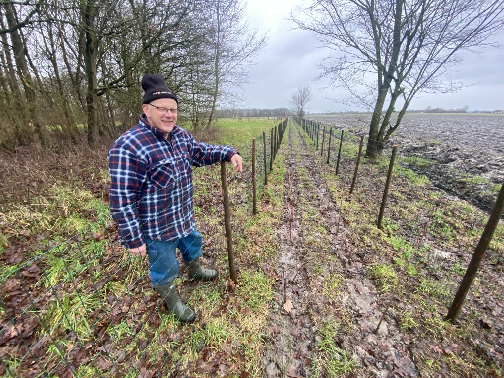Jaap Kwanten bij in 2024 door hem geplante haag met 14 soorten inheemse struiken