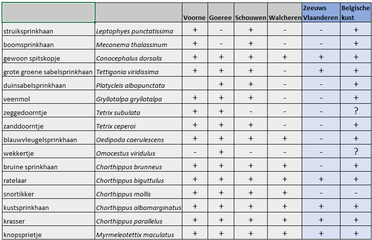 Sprinkhanen-inventarisatie in de duinen van Voorne (21 km-hokken), Goeree (19) en Schouwen (17, incl. 2 op de Brouwersdam), van 1990-1993. Tabel uit Lensink 1993 (bewerkt). Daarin ook een toelichting per soort en de bronnen voor Walcheren/Zeeuws Vlaanderen en de Belgische kust.