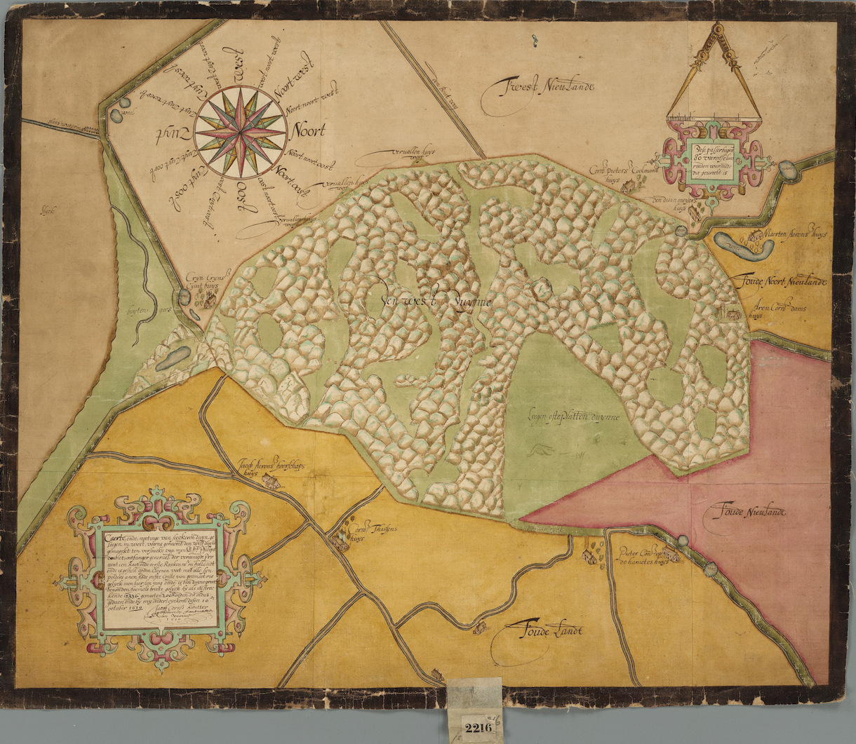 Jacob Cornelis Koutter 1610 (NA 4.VTH.2216) Kaart van de Westduinen en annexe polders op het eiland Goeree. De windroos laat zien dat de kaart niet noord-zuid maar west-oost is georiënteerd, d.w.z het noorden is hier rechts.