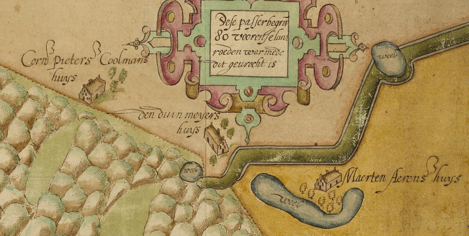 Het lijkt een raadsel dat van een zo afgelegen gebied als de Westduinen zo’n kostbare kaart is gemaakt. Maar in de jaren van de jonge republiek (ontstaan 1572) was van het overgeleverde (voorheen grafelijke) duinbezit niet altijd duidelijk hoe groot het was en wie er woonden en hoe (en bij wie) er belastingen konden worden geheven. Voor de herkenbaarheid kantelden we de kaart en voegden er namen aan toe.